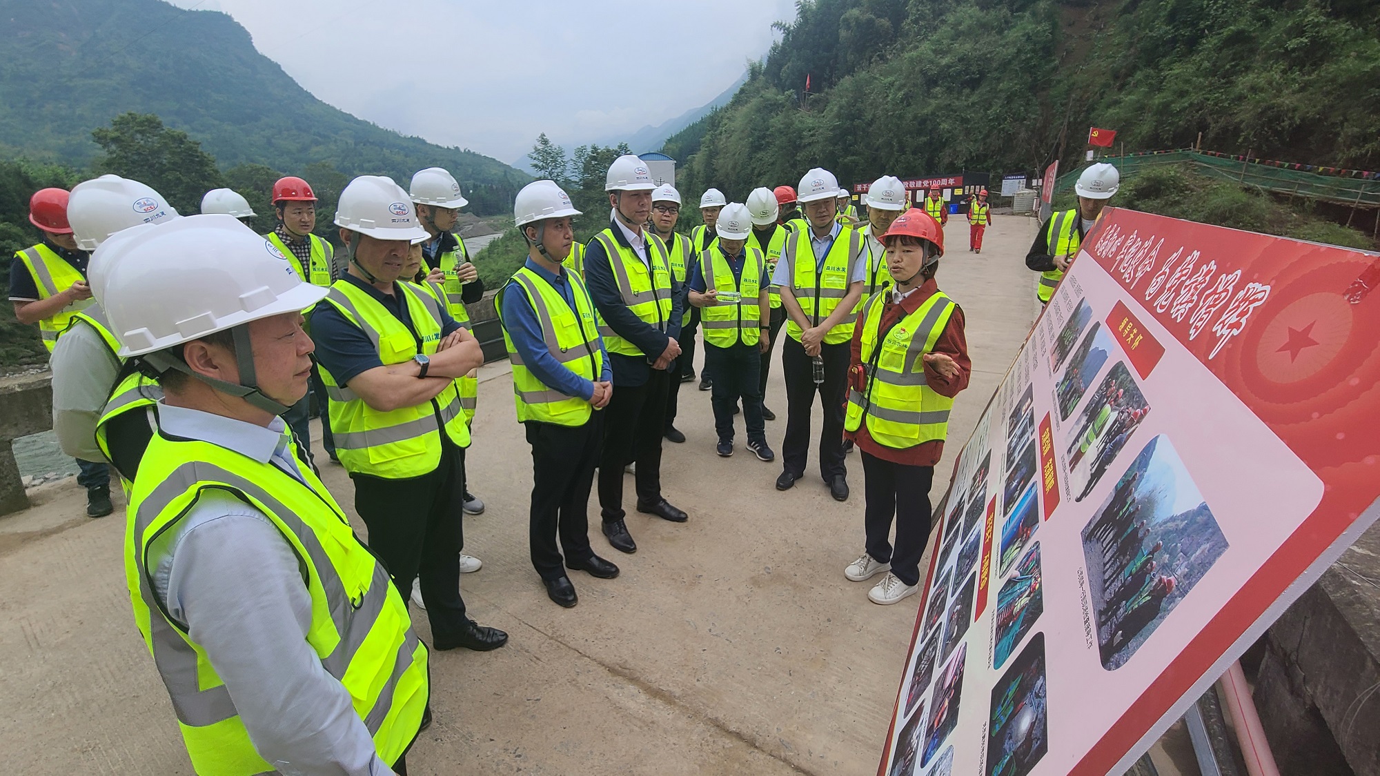 懷著昨日在瀘定緬懷革命先烈的激情,總部全體黨員干部歷經(jīng)3個半小時車程來到金雞峽壩址勘探平硐項目施工現(xiàn)場。下車之后,映入眼簾的是一座直沖云霄的大山、一片險象環(huán)生的懸崖峭壁。在工程局公司主要負(fù)責(zé)同志介紹項目概況后,項目部黨員同志以“初心不忘,使命召喚; 奮力拼搏,唯有圖強(qiáng)”為題,為大家上了一堂微黨課。微黨課重點反映了工程局公司堅持將黨建工作與項目建設(shè)深度融合所取得的成效,堅持“黨建融于項目中,黨旗立在工地上”,讓鮮紅的黨旗在施工一線高高飄揚;講述了施工建設(shè)中涌現(xiàn)的先進(jìn)黨員代表事跡;講述了在70年代艱苦歲月工程局公司修建玉溪河引水大壩的感人故事;講述了在黨員干部的先鋒模范帶領(lǐng)下,全體干部職工發(fā)揚“不懼艱險、不畏疲勞、無私奉獻(xiàn)、勇挑重?fù)?dān)”的水利鐵軍精神,沿著既定目標(biāo),高效、安全地完成集團(tuán)交給的任務(wù)。