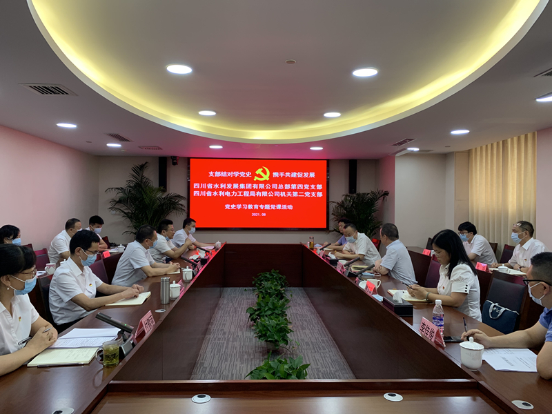 2021年8月4日,省水發(fā)集團(tuán)總部第四黨支部與工程局公司機(jī)關(guān)第二黨支部在工程局公司成都總部會(huì)議室聯(lián)合開展“支部結(jié)對(duì)學(xué)黨史.攜手共建促發(fā)展”黨史學(xué)習(xí)教育專題黨課活動(dòng)。集團(tuán)黨委委員、工程局公司黨委書記、董事長(zhǎng)代勇,集團(tuán)黨委委員、總工程師黃永沾,集團(tuán)副總經(jīng)理隆文非以普通黨員身份參加所在支部組織的活動(dòng)。