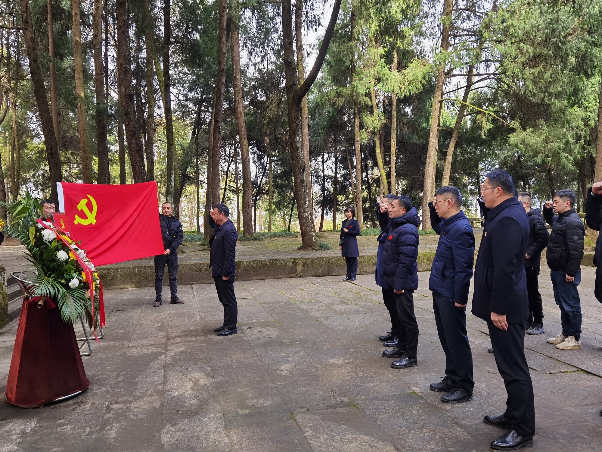 在通江縣王坪烈士陵園,從“鐵血丹心”廣場拾級而上,公司黨委副書記、副總經理郎波、公司黨委副書記、紀委書記陳雷、公司黨委委員、副總經理袁本松率公司黨員、入黨積極分子一行來到烈士紀念碑前,莊嚴肅穆的肅立,默哀鞠躬,向長眠于此的革命英烈表達無盡的哀思和敬仰。郎波代表公司黨委向革命先烈敬獻花籃,機關黨支部書記葉發科帶領黨員同志在鮮紅的黨旗前,重溫了入黨誓詞。